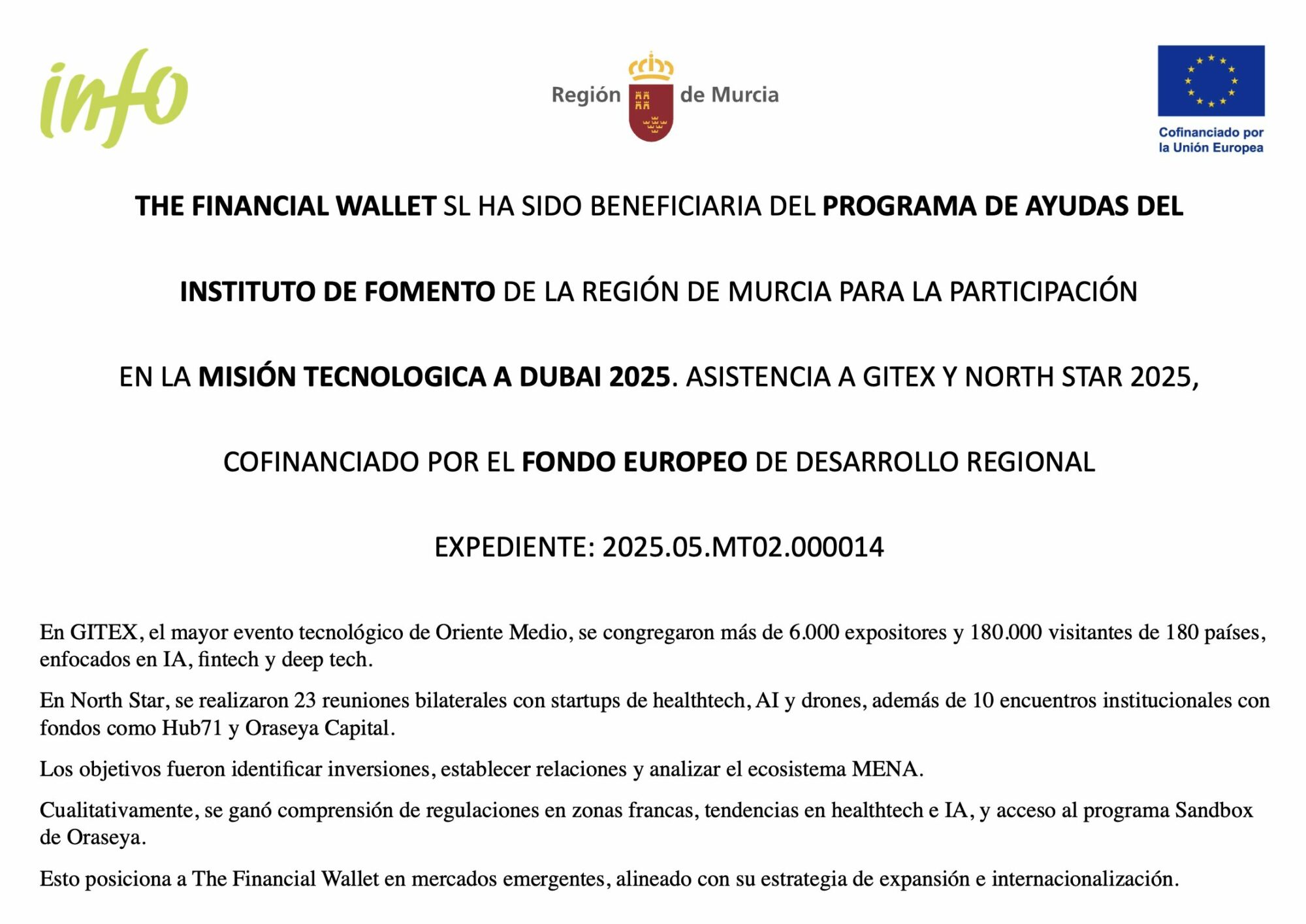 Nuestra empresa The Financial Wallet ha participado en el Programa de Ayuda para la participación en la Misión Tecnológica a Dubai con la asistencia a GITEX y NORTH STAR 2025, organizada por el Instituto de Fomento de la Región de Murcia, y cofinanciada por el Fondo Europeo de Desarrollo Regional y el Instituto de Fomento de la Región de Murcia. Proyecto: 2025.05.MT02.000014.